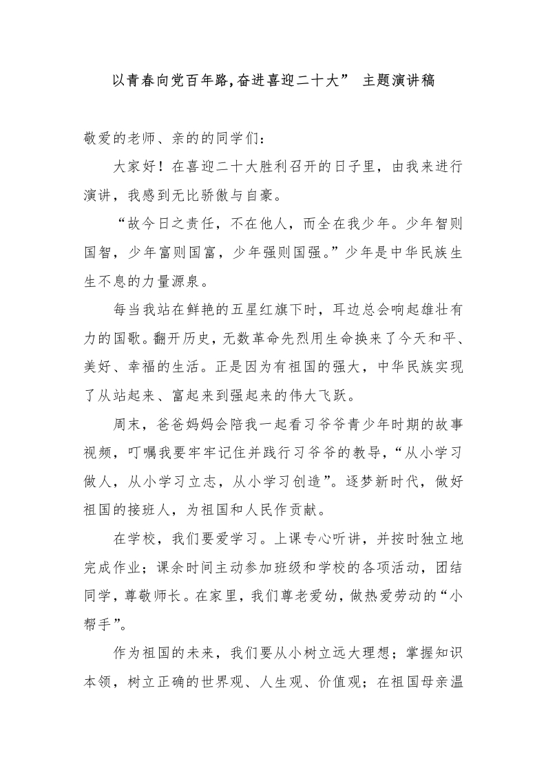 以青春向党百年路,奋进喜迎二十大” 主题演讲稿