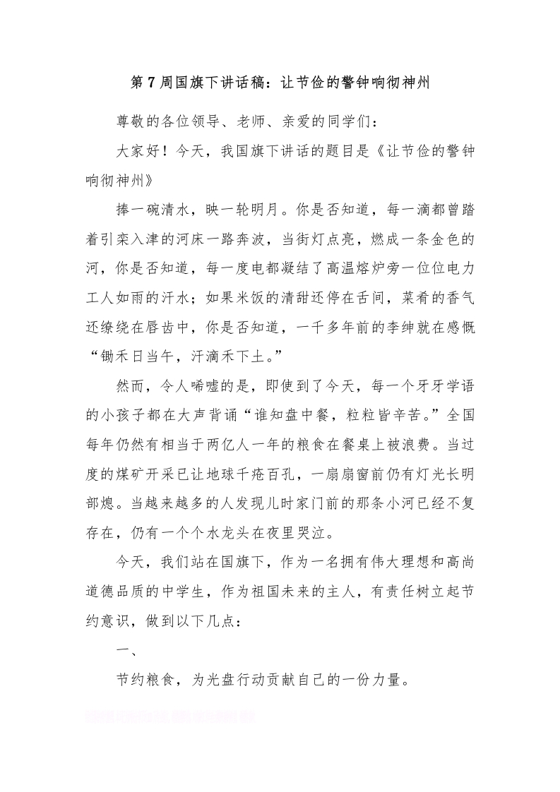 第7周国旗下讲话稿:让节俭的警钟响彻神州[推荐]