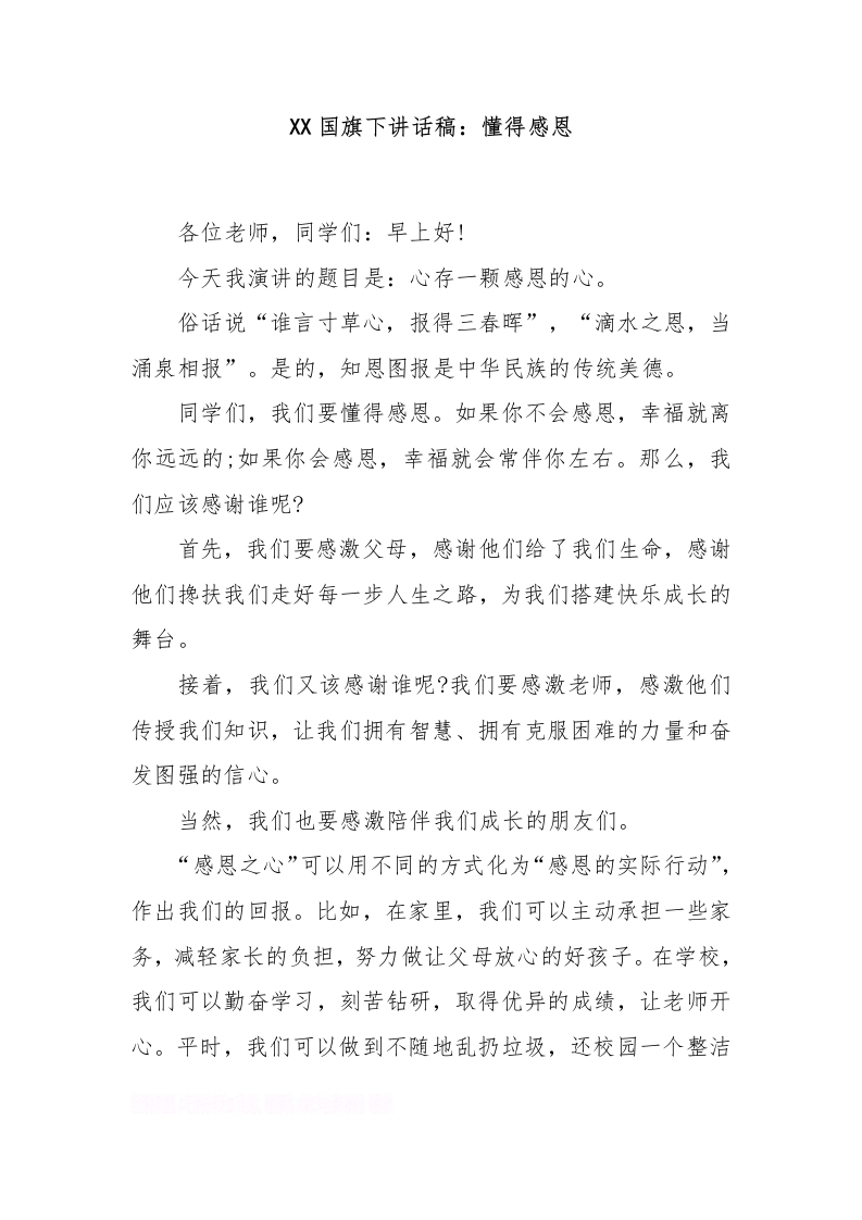 首页主题节日感恩教育XX国旗下讲话稿:懂得感恩[推荐]