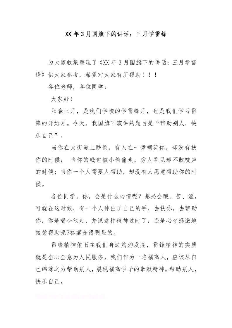 XX年3月国旗下的讲话:三月学雷锋[推荐]