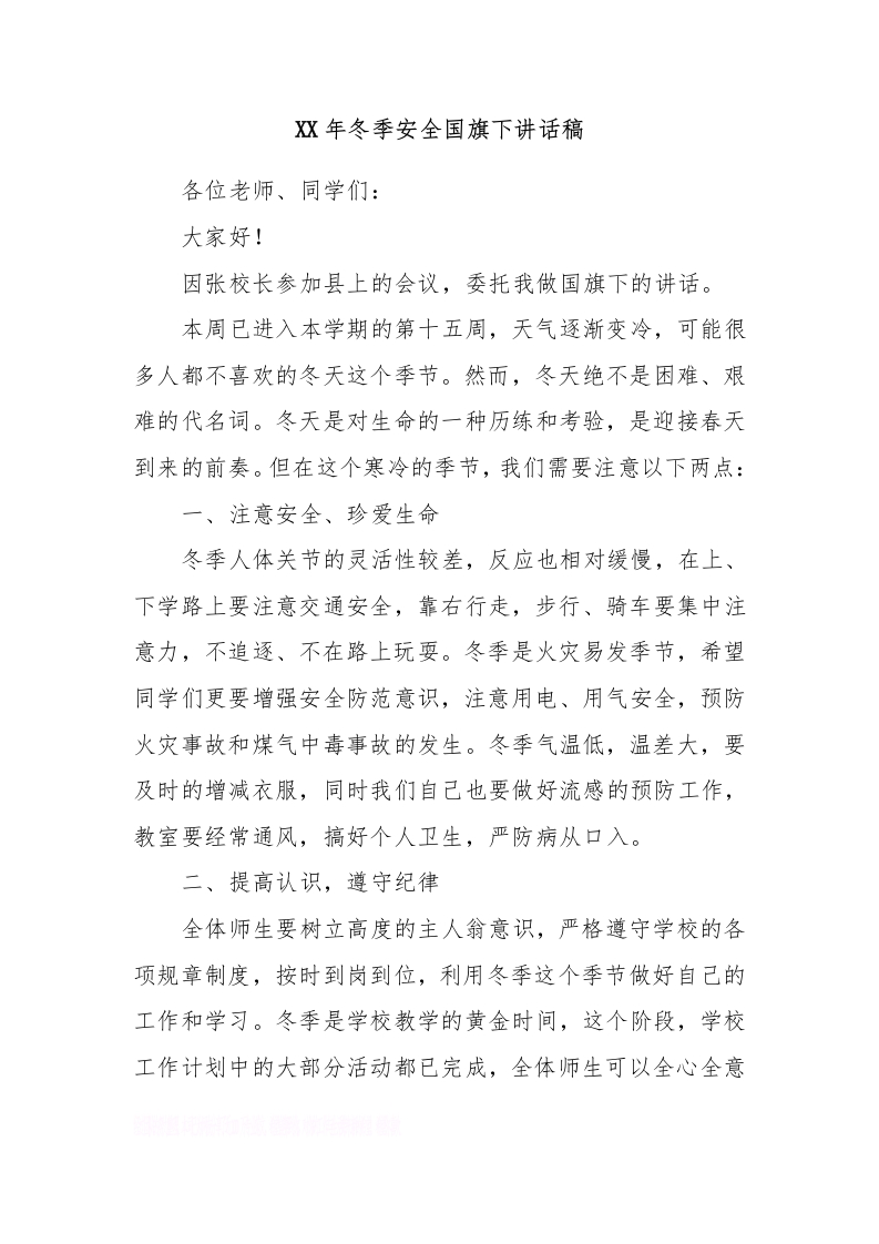 XX年冬季安全国旗下讲话稿[推荐]