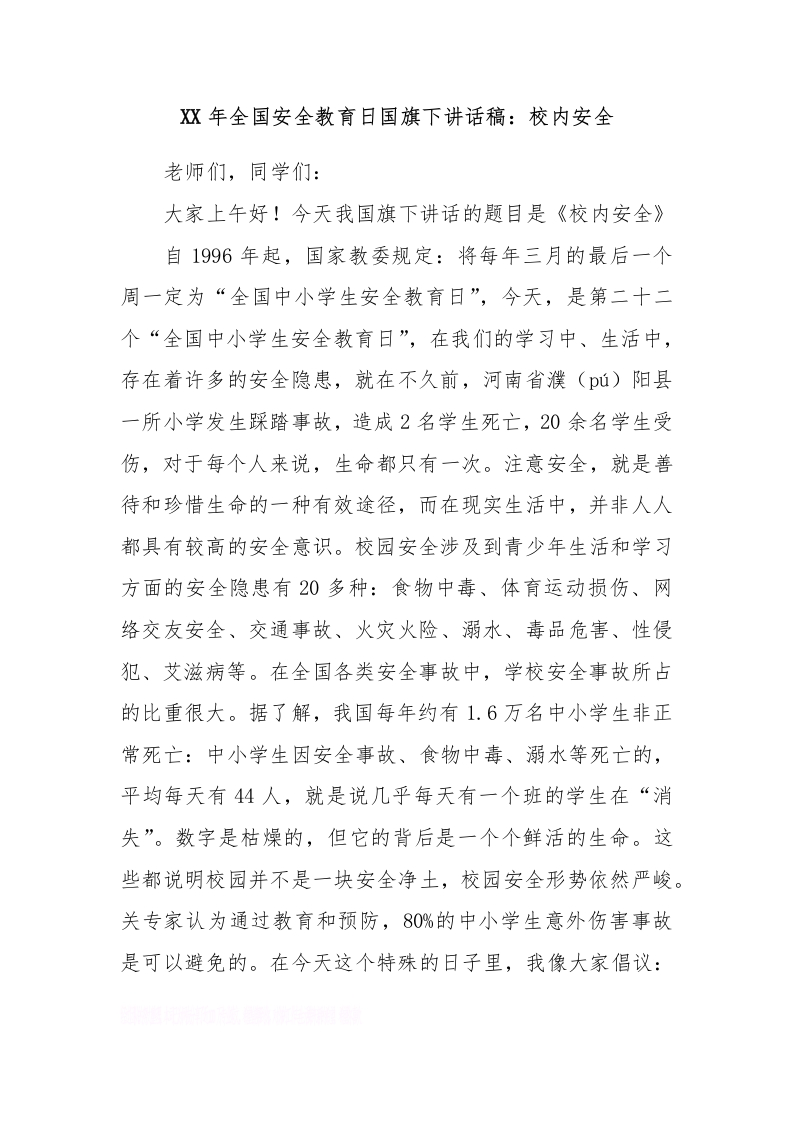 XX年全国安全教育日国旗下讲话稿:校内安全[推荐]