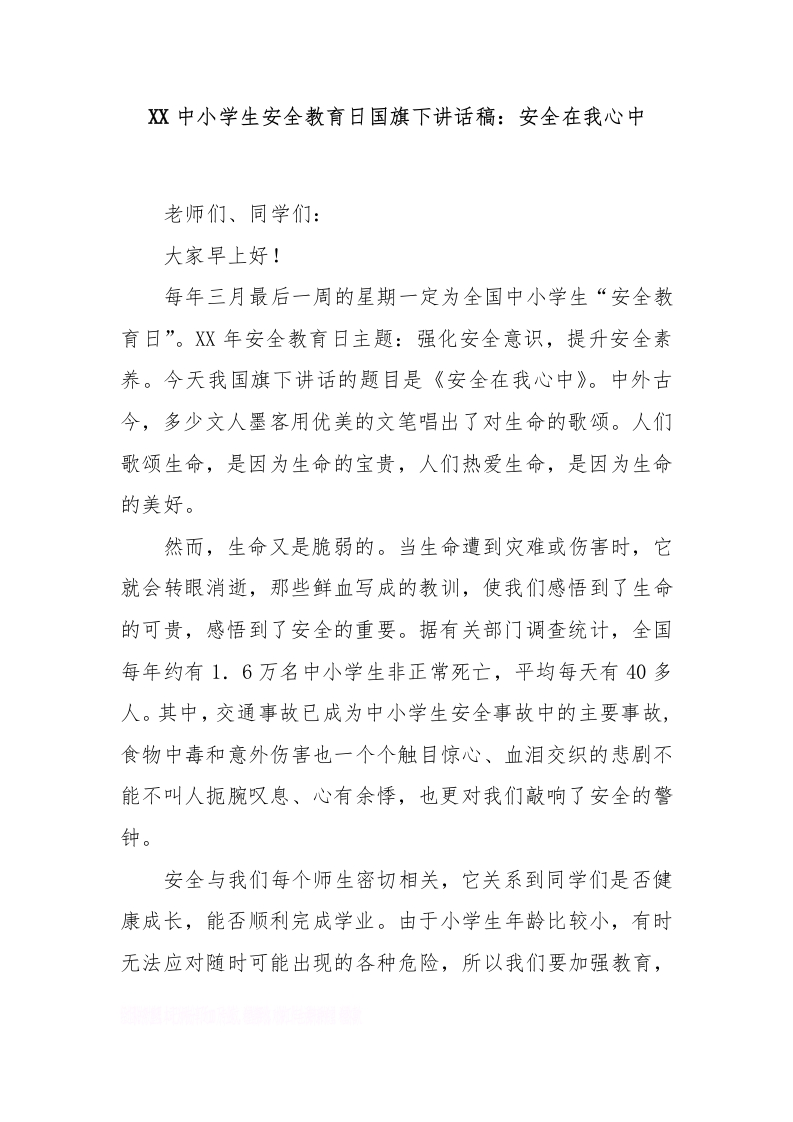 XX中小学生安全教育日国旗下讲话稿:安全在我心中[推荐]