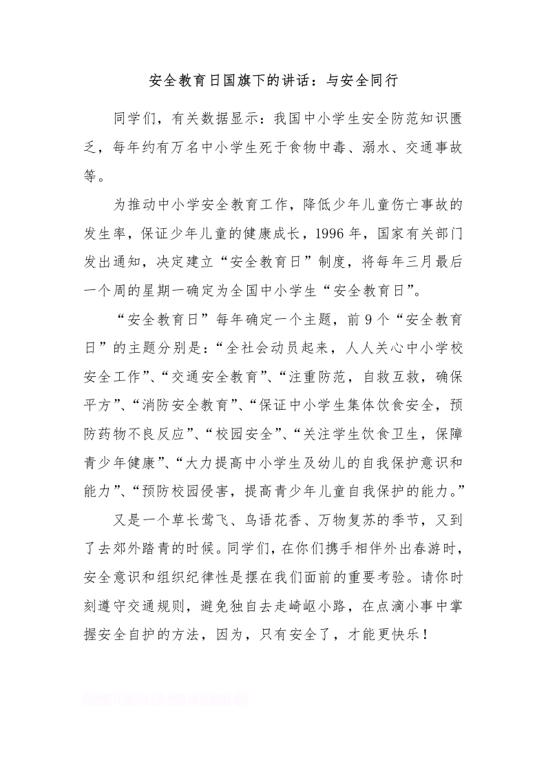 首页主题节日主题活动安全教育日国旗下的讲话:与安全同行[推荐]