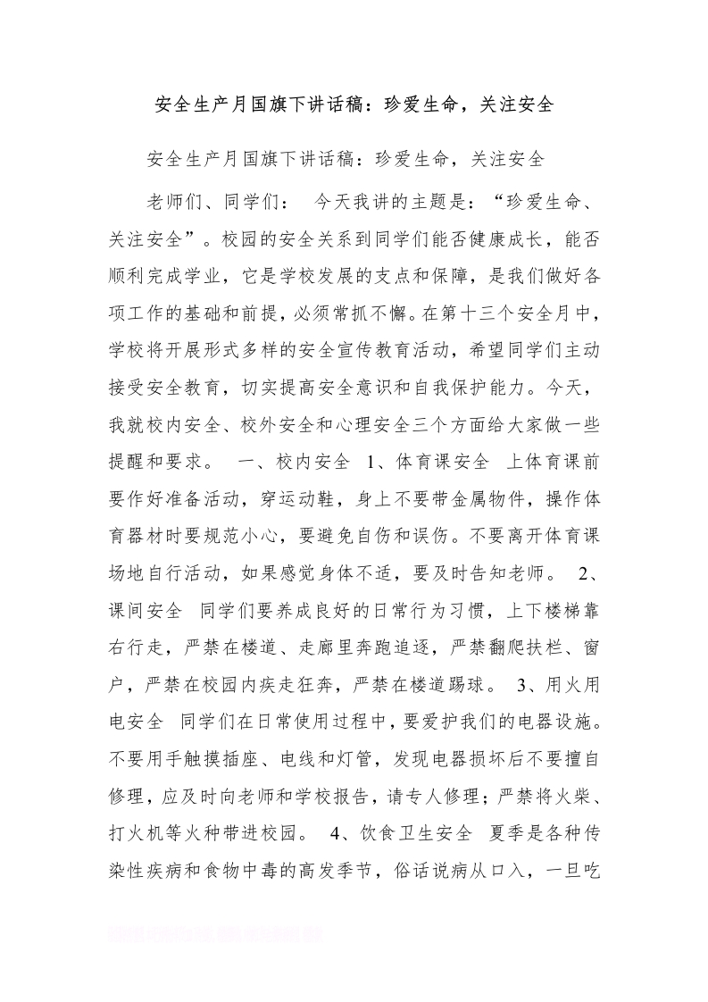 安全生产月国旗下讲话稿:珍爱生命,关注安全[推荐](1)