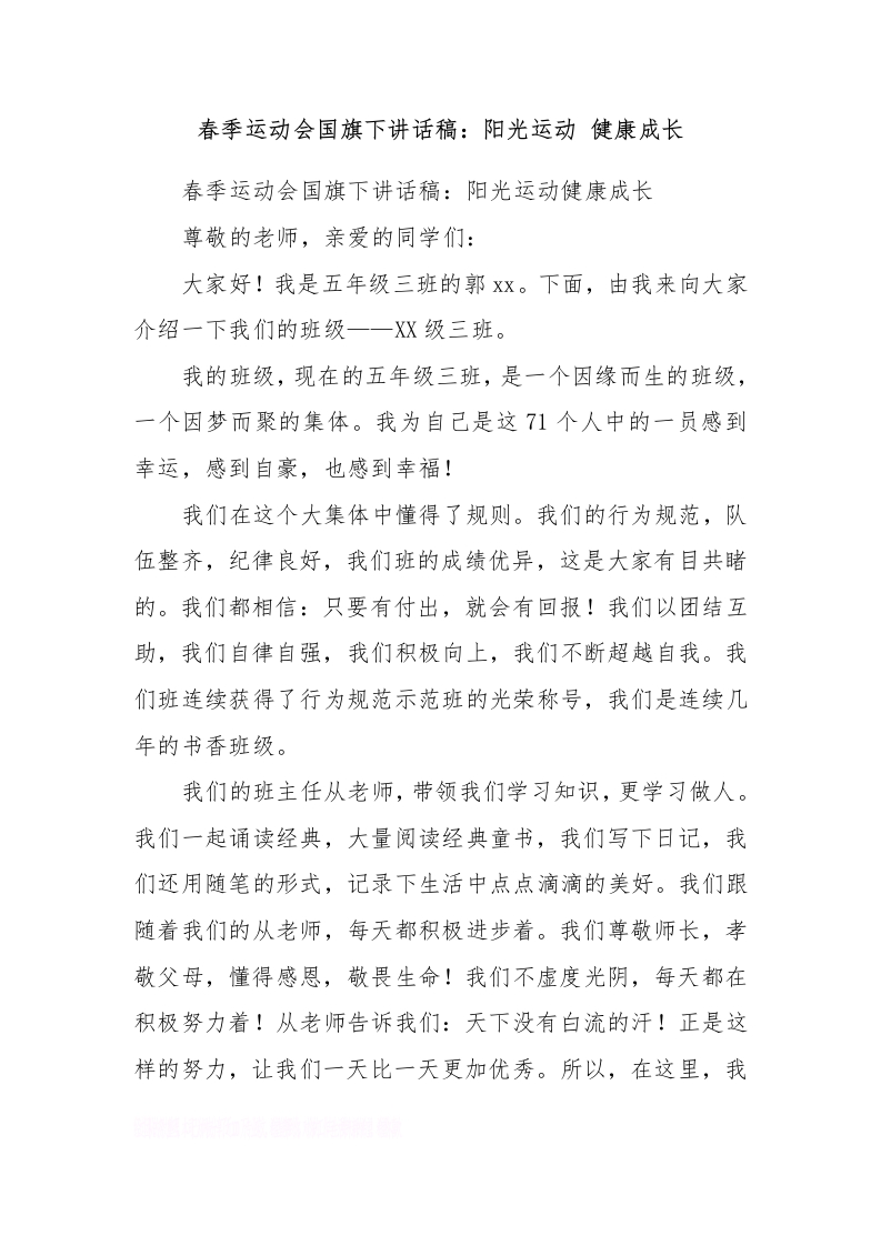 春季运动会国旗下讲话稿:阳光运动 健康成长_1[推荐]