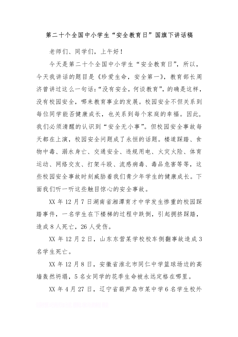第二十个全国中小学生“安全教育日”国旗下讲话稿[推荐]