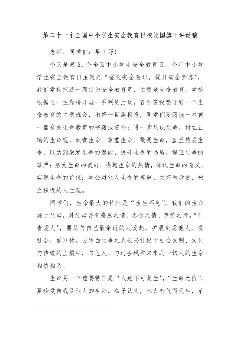 第二十一个全国中小学生安全教育日校长国旗下讲话稿[推荐]