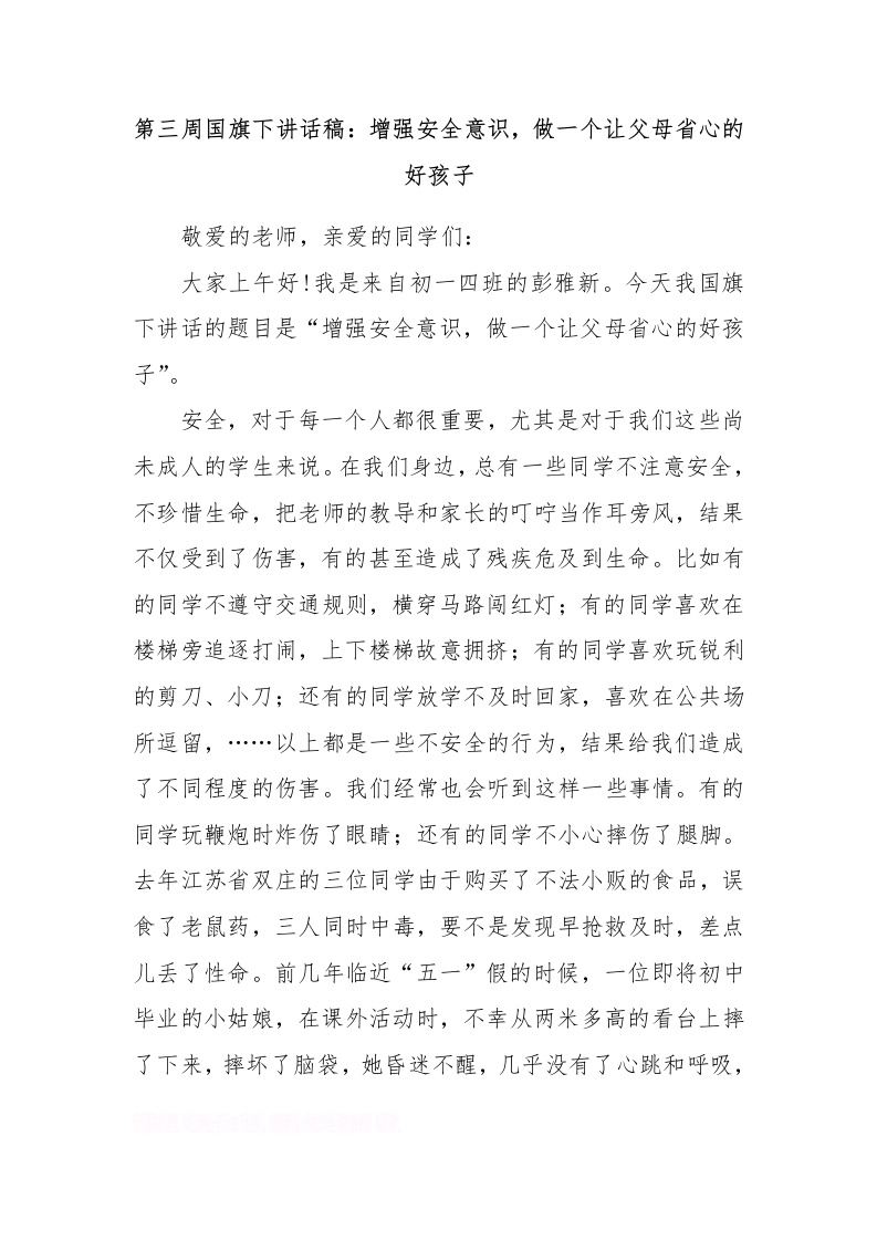 第三周国旗下讲话稿:增强安全意识,做一个让父母省心的好孩子[推荐]