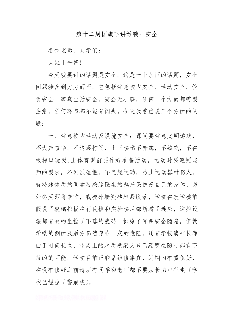 首页主题节日主题活动第十二周国旗下讲话稿:安全[推荐]