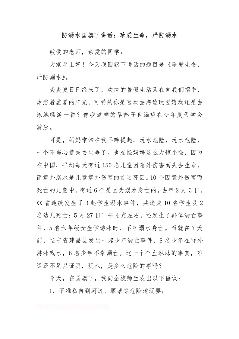 防溺水国旗下讲话:珍爱生命,严防溺水[推荐]