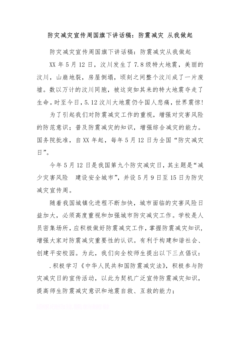 防灾减灾宣传周国旗下讲话稿:防震减灾 从我做起[推荐]