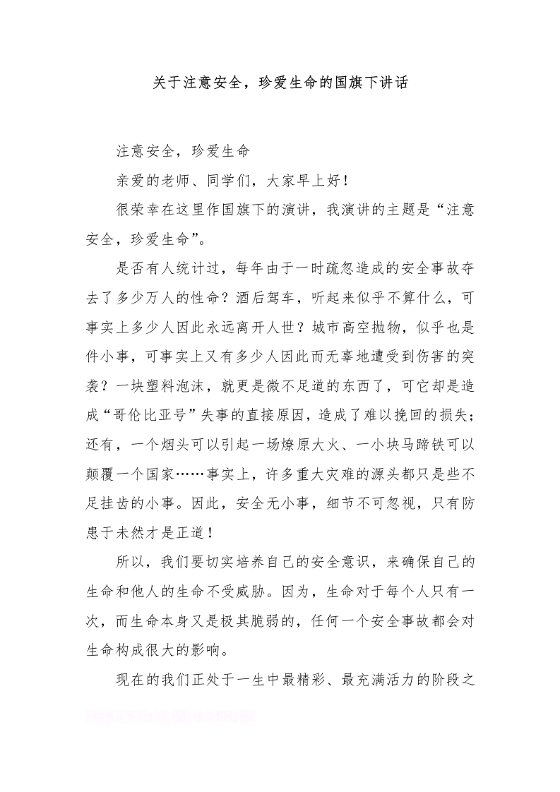 关于注意安全,珍爱生命的国旗下讲话[推荐]