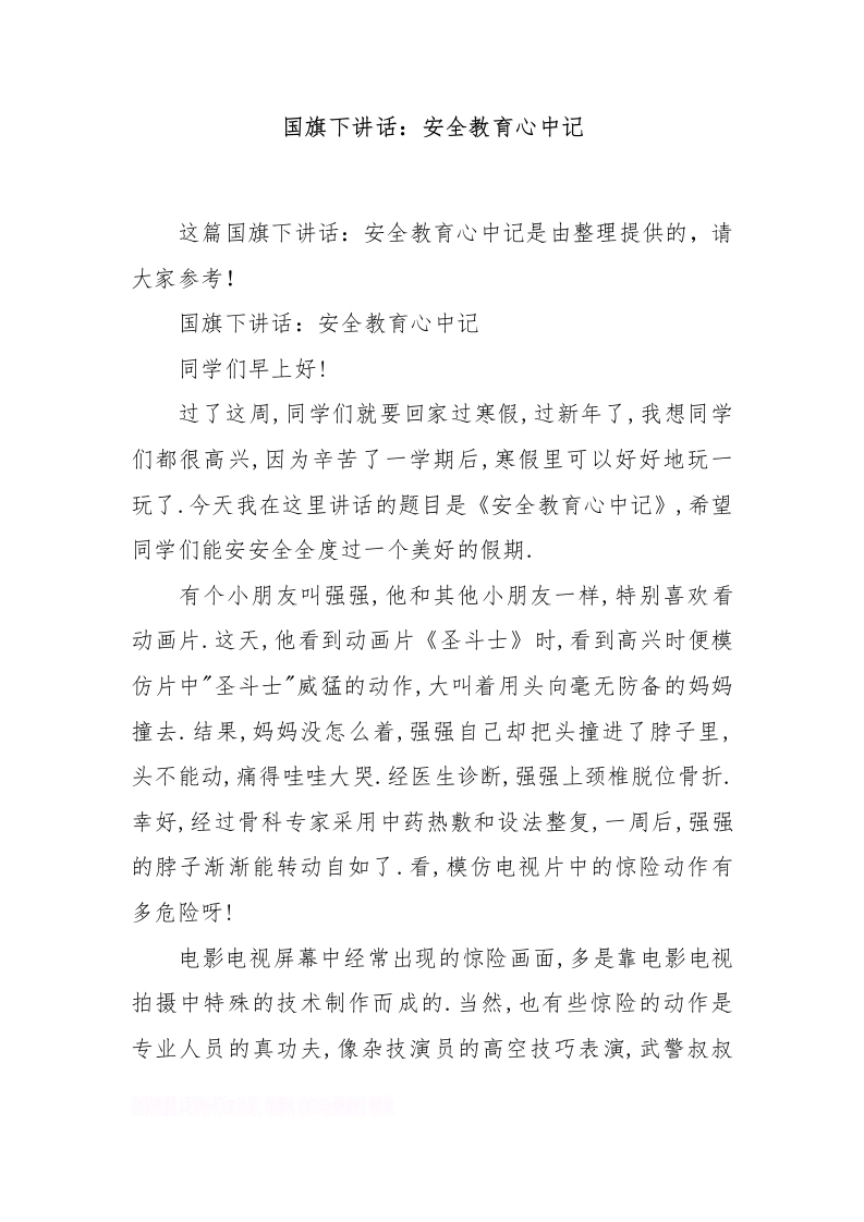 首页主题节日主题活动国旗下讲话:安全教育心中记[推荐]