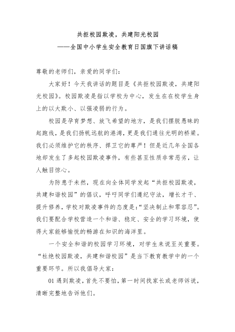 国旗下讲话——《共拒校园欺凌,共建阳光校园》
