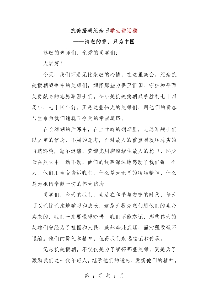 首页主题节日主题活动抗美援朝纪念日学生讲话稿