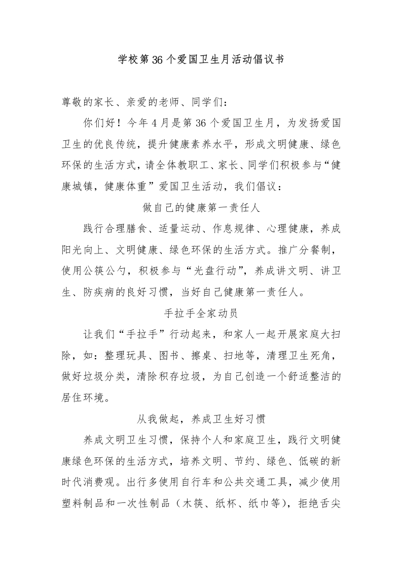 首页主题节日主题活动学校第36个爱国卫生月活动倡议书