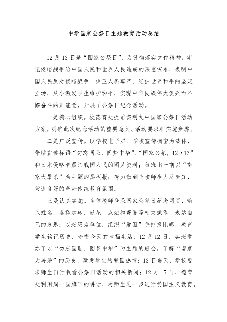 中学国家公祭日主题教育活动总结