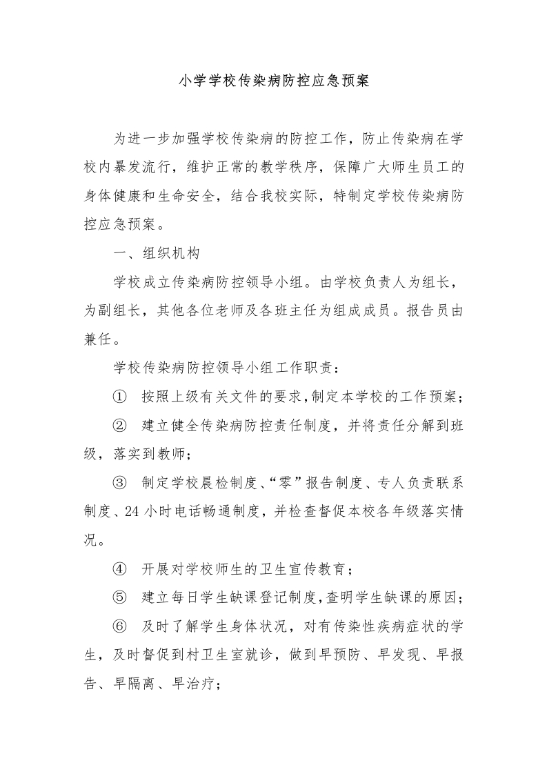 小学学校传染病防控应急预案