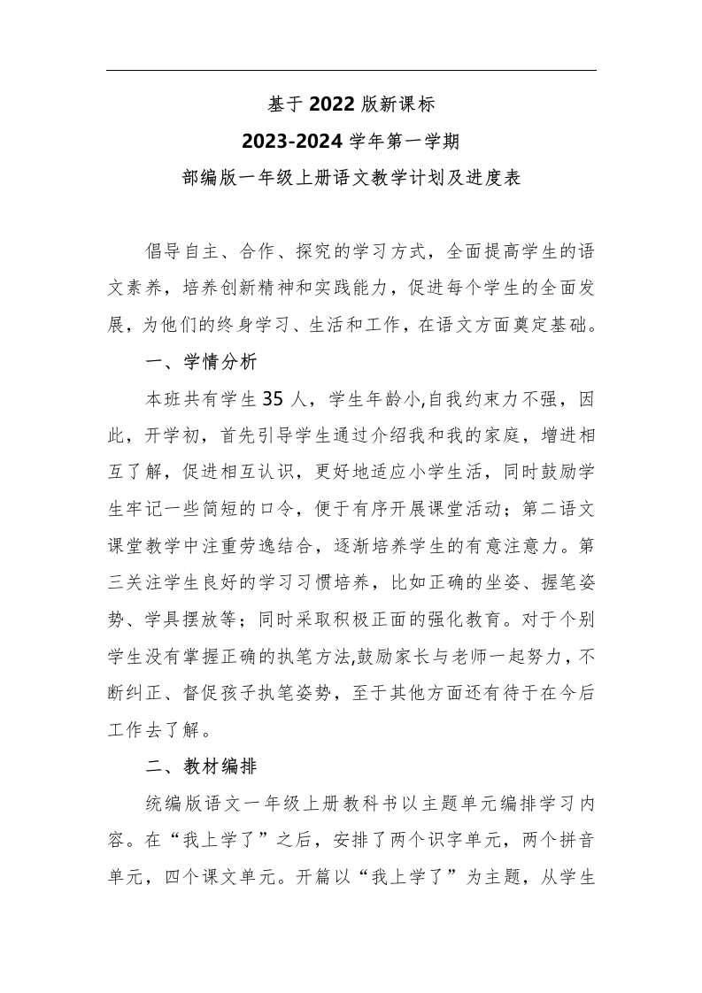 新课标2023-2024学年第一学期部编版一年级上册语文教学计划及进度表