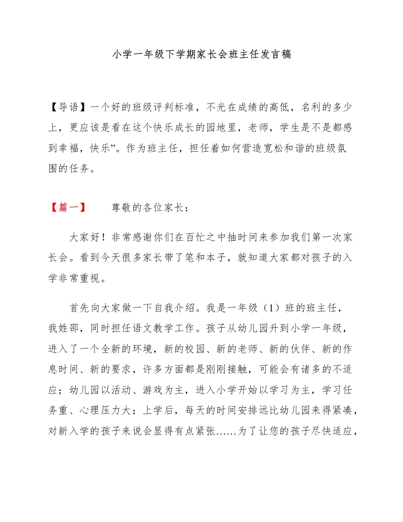 首页班主任资料家长家委小学一年级下学期家长会班主任发言稿