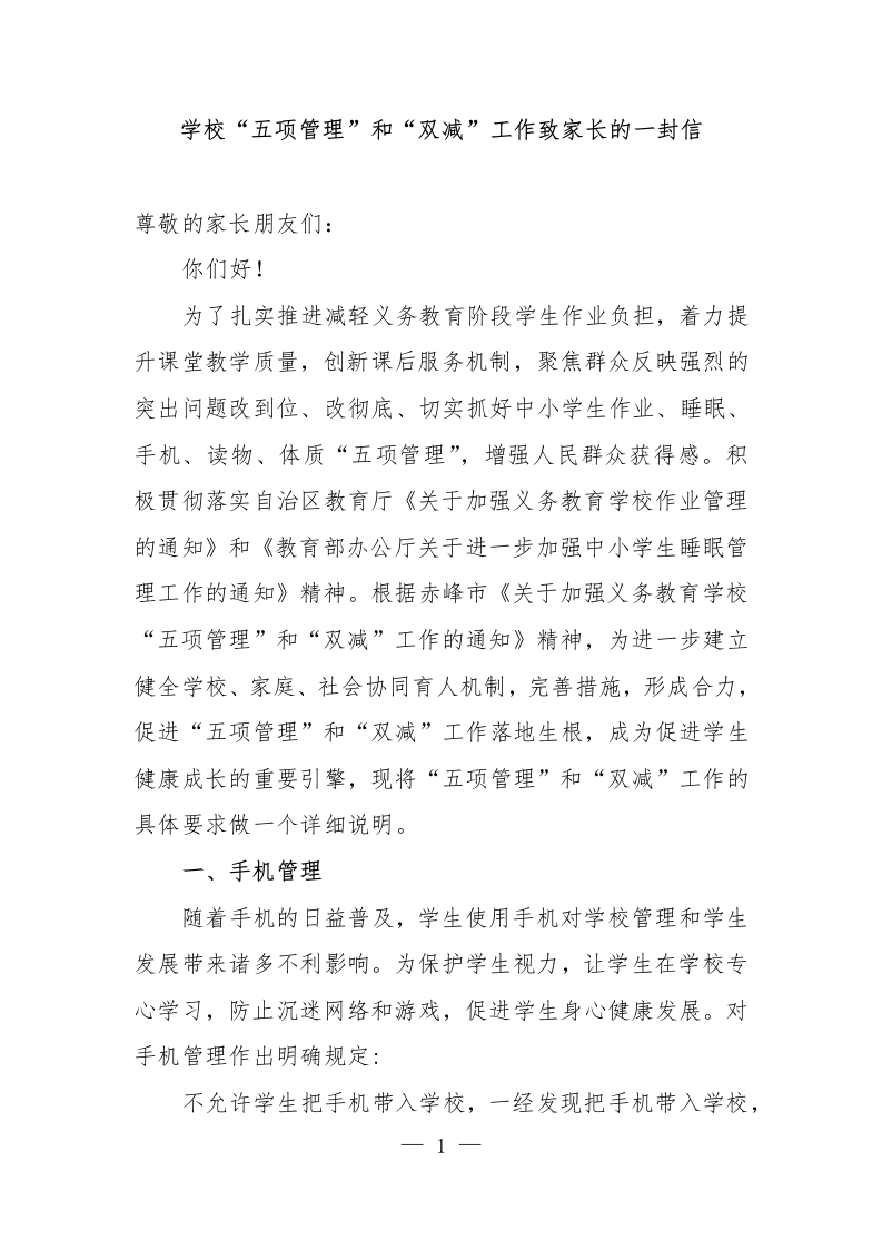 学校“五项管理”和“双减”工作致家长的一封信