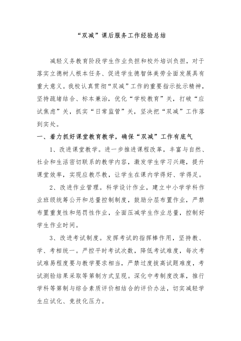 中小学“双减”课后服务工作经验总结