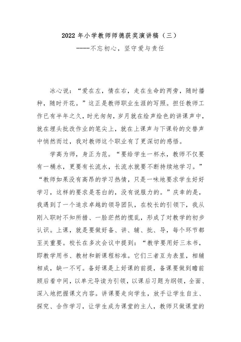 2022-2023年第一学期小学教师师德获奖演讲稿(三)(1)