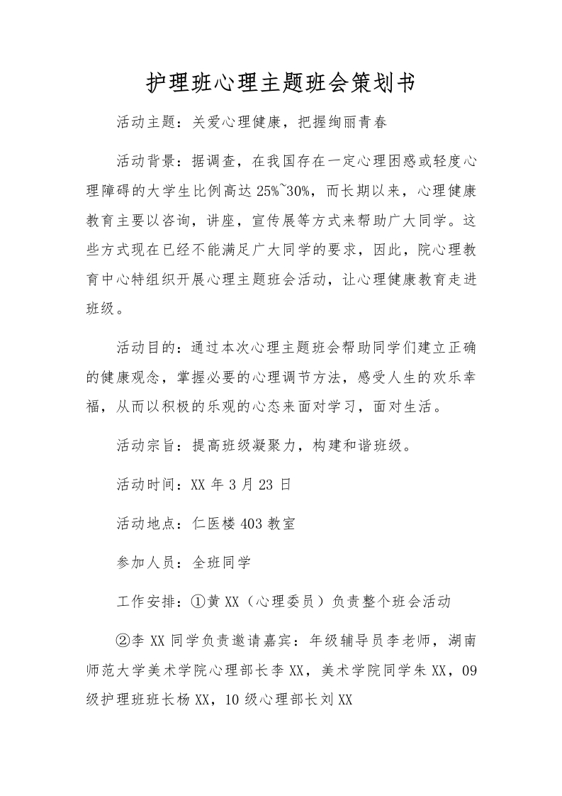 首页心里健康中学专题护理班心理主题班会策划书[推荐范文]