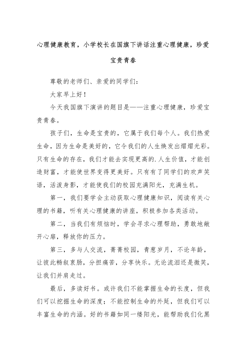 心理健康教育,小学校长在国旗下讲话注重心理健康,珍爱宝贵青春