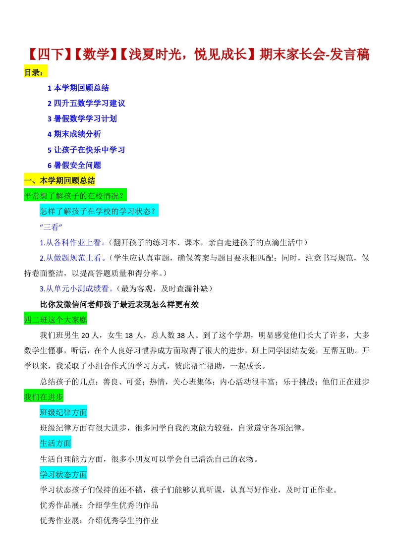 四年级下数学【浅夏时光,悦见成长】期末家长会发言稿