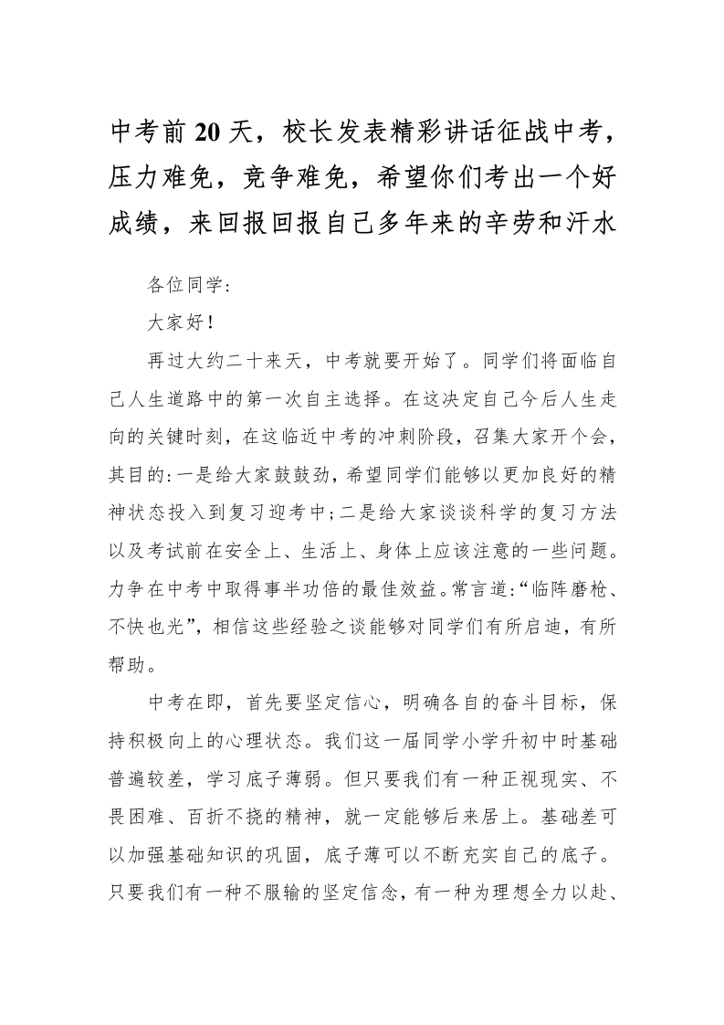 中考前20天,校长发表精彩讲话征战中考,压力难免,竞争难免,希望你们考出一个好成绩,来回报回报自己多年来的辛劳和汗水