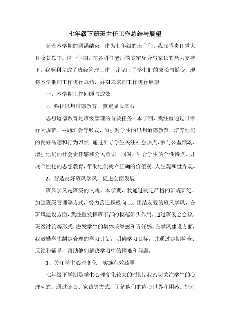 七年级下册班主任工作总结与展望随着本学期的圆满结束,作为七年级的班主任,我深感责任重大且收获频丰。这一学期,在各科任老师的紧密配合与家长的鼎力支持下,我顺利完成了班级管理工作,并见证了学生们的成长与蜕变。现将本学期的工作进行总结,并对未来的工作进行展望。一、本学期工作回顾与成效1、强化思想道德教育,奠定成长基石思想道德教育是班级管理的首要任务。本学期,我注重通过日常行为规范、主题班会等形式,加强对学生的思想道德教育,培养他们的良好品德和行为习惯。通过引导学生关注社会热点、参与公益活动,增强他们的社会责任感和公民意识。同时,结合学生的个性特点,开展个性化的思想教育,帮助他们树立正确的价值观、人生观和世界观。2、营造良好班风学风,促进全面发展班风学风是班级的灵魂。本学期,我通过制定严格的班规班纪、加强班级管理等方式,努力营造积极向上、团结友爱的班风学风。在班风建设方面,我注重发挥班干部的模范带头作用,通过班委会会议、班级讨论等形式,激发学生的集体荣誉感和责任感。在学风建设方面,我鼓励学生制定合理的学习计划,明确学习目标,并通过定期检查、反馈和辅导,帮助他们解决学习中的困难和问题。3、关注学生心理变化,实施有效疏导七年级下学期是学生心理变化较大的时期。我密切关注学生的心理动态,通过谈心、家访等方式,了解他们的内心世界和困惑。针对