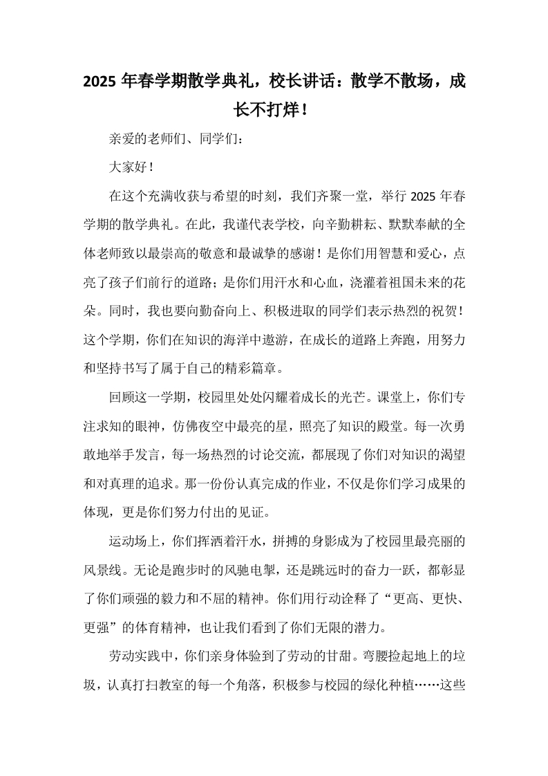 2025年春学期散学典礼,校长讲话:散学不散场,成长不打烊!亲爱的老师们、同学们:大家好!在这个充满收获与希望的时刻,我们齐聚一堂,举行2025年春学期的散学典礼。在此,我谨代表学校,向辛勤耕耘、默默奉献的全体老师致以最崇高的敬意和最诚挚的感谢!是你们用智慧和爱心,点亮了孩子们前行的道路:是你们用汗水和心血,浇灌着祖国未来的花朵。同时,我也要向勤奋向上、积极进取的同学们表示热烈的祝贺!这个学期,你们在知识的海洋中遨游,在成长的道路上奔跑,用努力和坚持书写了属于自己的精彩篇章。回顾这一学期,校园里处处闪耀着成长的光芒。课堂上,你们专注求知的眼神,仿佛夜空中最亮的星,照亮了知识的殿堂。每一次勇敢地举手发言,每一场热烈的讨论交流,都展现了你们对知识的渴望和对真理的追求。那一份份认真完成的作业,不仅是你们学习成果的体现,更是你们努力付出的见证。运动场上,你们挥洒着汗水,拼搏的身影成为了校园里最亮丽的风景线。无论是跑步时的风驰电掣,还是跳远时的奋力一跃,都彰显了你们顽强的毅力和不屈的精神。你们用行动诠释了“更高、更快、更强”的体育精神,也让我们看到了你们无限的潜力。劳动实践中,你们亲身体验到了劳动的甘甜。弯腰捡起地上的垃圾,认真打扫教室的每一个角落,积极参与校园的绿化种植…这些