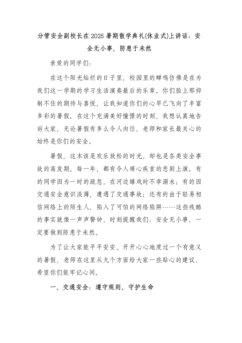 分管安全副校长在2025暑期散学典礼(休业式)上讲话:安全无小事,防患于未然亲爱的同学们:在这个阳光灿烂的日子里,校园里的蝉鸣仿佛是在为我们这一学期的学习生活演奏最后的乐章。你们脸上那抑制不住的期待与喜悦,让我知道你们的心早已飞向了丰富多彩的暑假。在这个充满美好憧憬的时刻,我想认真地告诉大家,无论暑假有多么令人向往,老师和家长最关心的始终是你们的安全。暑假,这本该是欢乐放松的时光,却也是各类安全事故的高发期。每一年,都有令人痛心疾首的悲剧上演。有的同学因为一时的疏忽,在河边嬉戏时不幸溺水;有的因交通安全意识淡薄,遭遇了交通事故;还有的由于轻易相信网络上的陌生人,陷入了可怕的网络陷阱…这些残酷的事实就像一声声警钟,时刻提醒我们:安全无小事,一定要做到防患于未然。为了让大家能平平安安、开开心心地度过一个有意义的暑假,老师在这里从九个方面给大家一些贴心的建议,希望你们能牢记心间。一、交通安全:遵守规则,守护生命