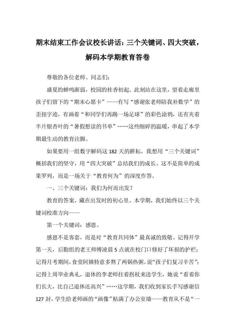 期末结束工作会议校长讲话:三个关键词、四大突破,解码本学期教育答卷尊敬的各位老师、同志们:盛夏的蝉鸣渐弱,校园的桂香初起。此刻站在这里,望着走廊里孩子们留下的“期末心愿卡”一一有写“感谢张老师陪我补数学”的歪扭字迹,有画着“和同学们再踢一场足球”的彩色涂鸦,还有夹着半片银杏叶的“暑假想读的书单”…这些细碎的温暖,串起了本学期最生动的教育注脚。如果要用一组数字解码这182天的耕耘,我想用“三个关键词”概括我们的坚守,用“四大突破”总结我们的成长。这不是简单的成果罗列,而是一场关于“教育何为”的深度作答。一、三个关键词:我们为何而出发?教育的答案,藏在出发时的初心里。本学期,我们始终以三个关键词校准方向一一第一个关键词:感恩。感恩不是客套,而是对“教育共同体”最真诚的致敬。记得开学第一天,后勤组的老王师傅凌晨5点就在校门口修好了坏损的护栏:记得月考期间,食堂阿姨特意多熬了两锅热粥,说“孩子们复习辛苦”:记得上周毕业典礼,退休的李老师拄着拐杖来送学生,她说“看着你们长大,比自己退休还高兴”…这学期,我们收到家长手写感谢信127封,学生给老师画的“画像”贴满了办公室墙一一教育从不是“一