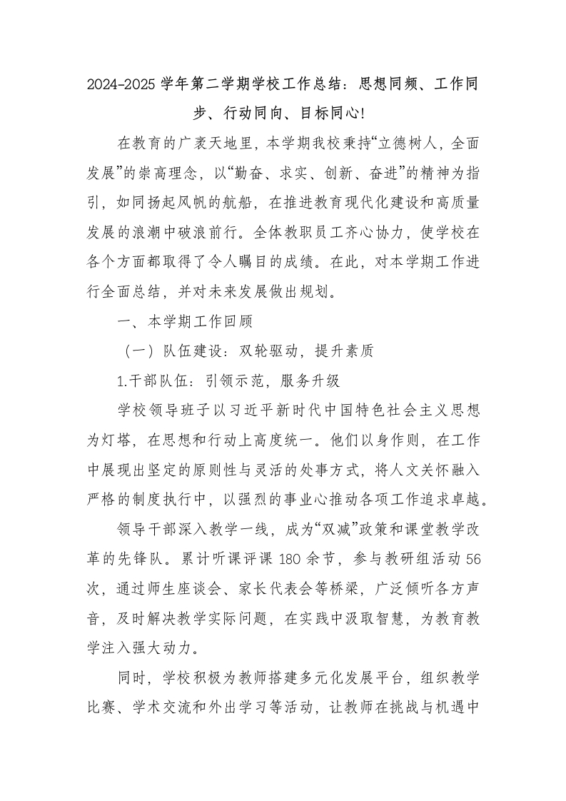 2024-2025学年第二学期学校工作总结:思想同频、工作同步、行动同向、目标同心!在教育的广袤天地里,本学期我校秉持“立德树人,全面发展”的崇高理念,以“勤奋、求实、创新、奋进”的精神为指引,如同扬起风帆的航船,在推进教育现代化建设和高质量发展的浪潮中破浪前行。全体教职员工齐心协力,使学校在各个方面都取得了令人瞩目的成绩。在此,对本学期工作进行全面总结,并对未来发展做出规划。一、本学期工作回顾(一)队伍建设:双轮驱动,提升素质1.干部队伍:引领示范,服务升级学校领导班子以习近平新时代中国特色社会主义思想为灯塔,在思想和行动上高度统一。他们以身作则,在工作中展现出坚定的原则性与灵活的处事方式,将人文关怀融入严格的制度执行中,以强烈的事业心推动各项工作追求卓越。领导干部深入教学一线,成为“双减”政策和课堂教学改革的先锋队。累计听课评课180余节,参与教研组活动56次,通过师生座谈会、家长代表会等桥梁,广泛倾听各方声音,及时解决教学实际问题,在实践中汲取智慧,为教育教学注入强大动力。同时,学校积极为教师搭建多元化发展平台,组织教学比赛、学术交流和外出学习等活动,让教师在挑战与机遇中