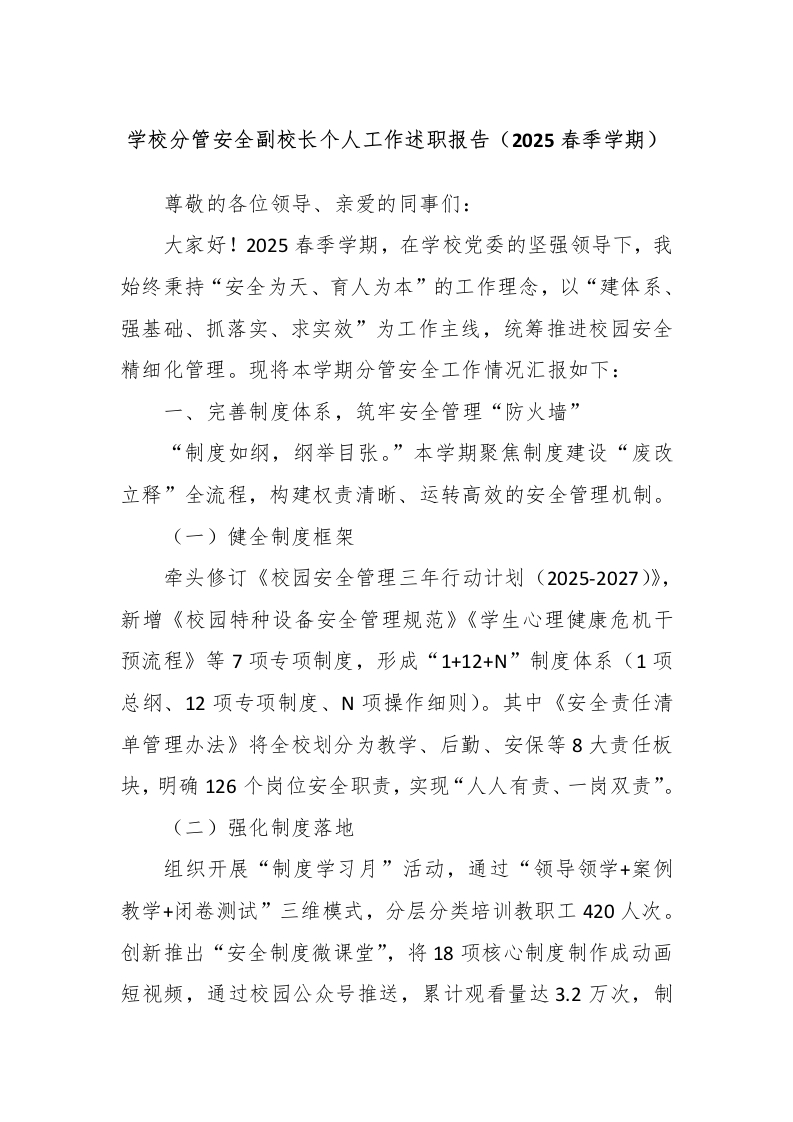 学校分管安全副校长个人工作述职报告(2025春季学期)尊敬的各位领导、亲爱的同事们:大家好!2025春季学期,在学校党委的坚强领导下,我始终秉持“安全为天、育人为本”的工作理念,以“建体系、强基础、抓落实、求实效”为工作主线,统筹推进校园安全精细化管理。现将本学期分管安全工作情况汇报如下:一、完善制度体系,筑牢安全管理“防火墙”“制度如纲,纲举目张。”本学期聚焦制度建设“废改立释”全流程,构建权责清晰、运转高效的安全管理机制。(一)健全制度框架牵头修订《校园安全管理三年行动计划(2025-2027)》,新增《校园特种设备安全管理规范》《学生心理健康危机干预流程》等7项专项制度,形成“1+12+N”制度体系(1项总纲、12项专项制度、N项操作细则)。其中《安全责任清单管理办法》将全校划分为教学、后勤、安保等8大责任板块,明确126个岗位安全职责,实现“人人有责、一岗双责”。(二)强化制度落地组织开展“制度学习月”活动,通过“领导领学+案例教学+闭卷测试”三维模式,分层分类培训教职工420人次。创新推出“安全制度微课堂”,将18项核心制度制作成动画短视频,通过校园公众号推送,累计观看量达3.2万次,制