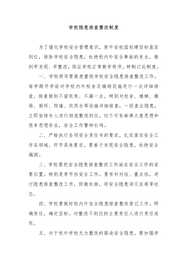 学校隐患排查整改制度为了强化学校安全管理意识,使平安校园创建目标落实到位,排除学校安全隐患,杜绝校内外安全事故的发生,做到早发现、早整改,保证学校正常教学秩序,特制订此制度。一、学校领导要高度重视学校安全隐患排查整改工作。每学期开学前对学校内外校舍及辅助设施进行一次详细排查,排查做到不留死角、不漏一点,特别对校舍、楼梯、操场、厕所、院墙、饮用水等设施详细排查,一经查出隐患,立即安排专人进行彻底整改到位,切不可有麻痹大意思想和侥幸思想存在,安全工作警钟长鸣。二、严格执行各项安全责任书的要求,扎实落实安全工作各领域、环节具体要求。要善于发现安全隐患,杜绝安全漏洞。三、学校要把安全隐患排查整改工作放在安全工作的首要位置。特别是季节性安全工作,要有针对性、重点性,进行隐患排查整改工作,防微杜渐,将安全隐患消灭在萌芽状态。四、学校要做好校内外安全隐患排查整改登记工作,明确责任,确定目标。对整改不到位的主要责任人进行责任追究。五、对于校外学校无力整改的路途安全隐患,要加强学