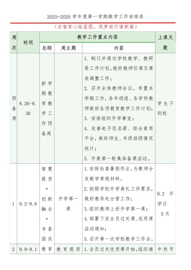 2025-2026学年度第一学期教学工作安排表(启智育心绘蓝图,筑梦前行谱新篇)周教学工作重点内容上课天时间次总纲周主题内容数1.制订并通过学校教学、教研等工作计划,做好教师任课及课表调整工作;新学期2.召开全体教师会议,布置本教预学期工作,各年级组、各学科教8.26-8.育教学生不备师做好各项教育教学工作计划;30学到校周3.安排组织开学事宜;作预4.完善电子花名册、综合素质备周平台,做好师生、年级班级情况统计;5.开展第一轮集体备课活动。智慧1.安排检查暑假作业,为教师分提质发教学常规材料。2.按照学校开学典礼工作要求,9.2开创新开学第一做好教导处分管工作:19.2-9.6学日融合课3.组织教师上好开学第一课;5天4.部署下发全员过关课、优质课书香活动通知;国庆5.召开第一次学校教学工作会。29.9-9.1教育教育提质1.全员过关优质课开始,组织推中秋节