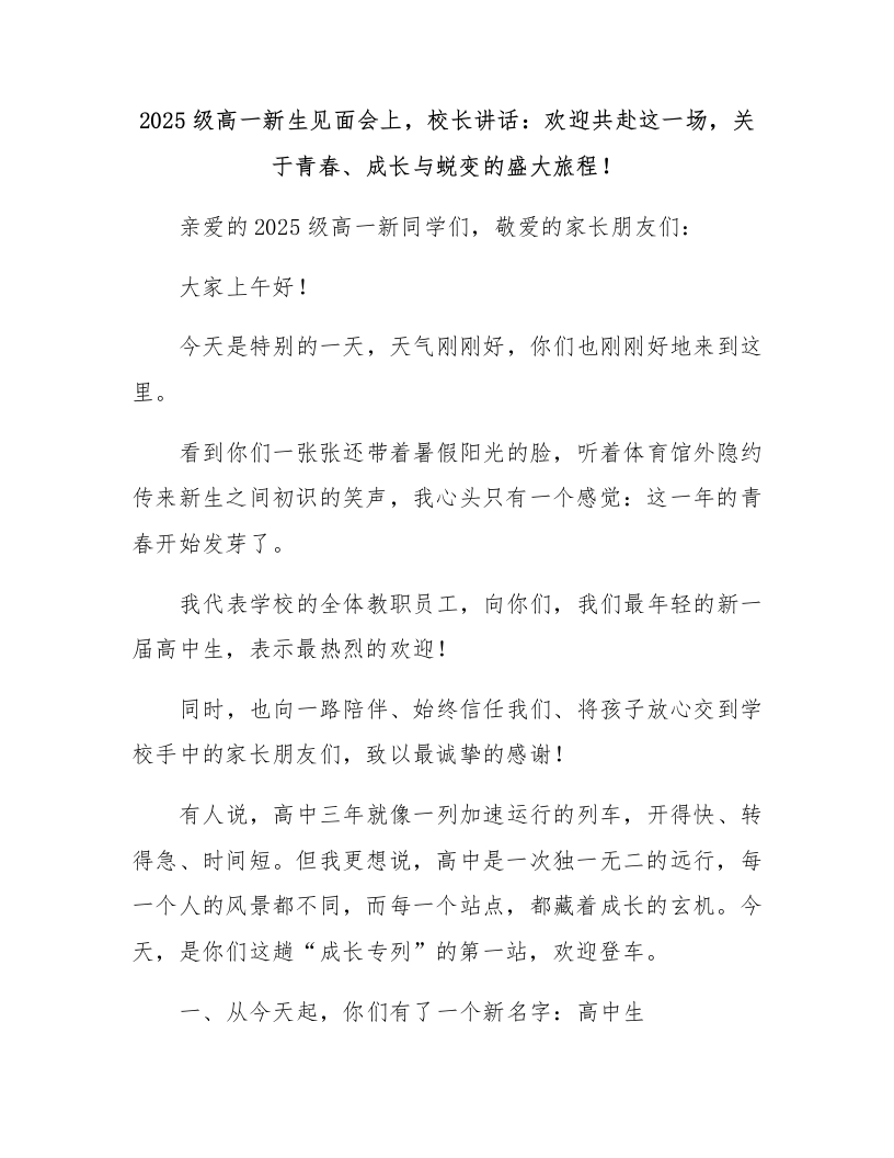 2025级高一新生见面会上,校长讲话:欢迎共赴这一场,关于青春、成长与蜕变的盛大旅程!亲爱的2025级高一新同学们,敬爱的家长朋友们:大家上午好!今天是特别的一天,天气刚刚好,你们也刚刚好地来到这里。看到你们一张张还带着暑假阳光的脸,听着体育馆外隐约传来新生之间初识的笑声,我心头只有一个感觉:这一年的青春开始发芽了。我代表学校的全体教职员工,向你们,我们最年轻的新一届高中生,表示最热烈的欢迎!同时,也向一路陪伴、始终信任我们、将孩子放心交到学校手中的家长朋友们,致以最诚挚的感谢!有人说,高中三年就像一列加速运行的列车,开得快、转得急、时间短。但我更想说,高中是一次独一无二的远行,每一个人的风景都不同,而每一个站点,都藏着成长的玄机。今天,是你们这趟“成长专列”的第一站,欢迎登车。一、从今天起,你们有了一个新名字:高中生