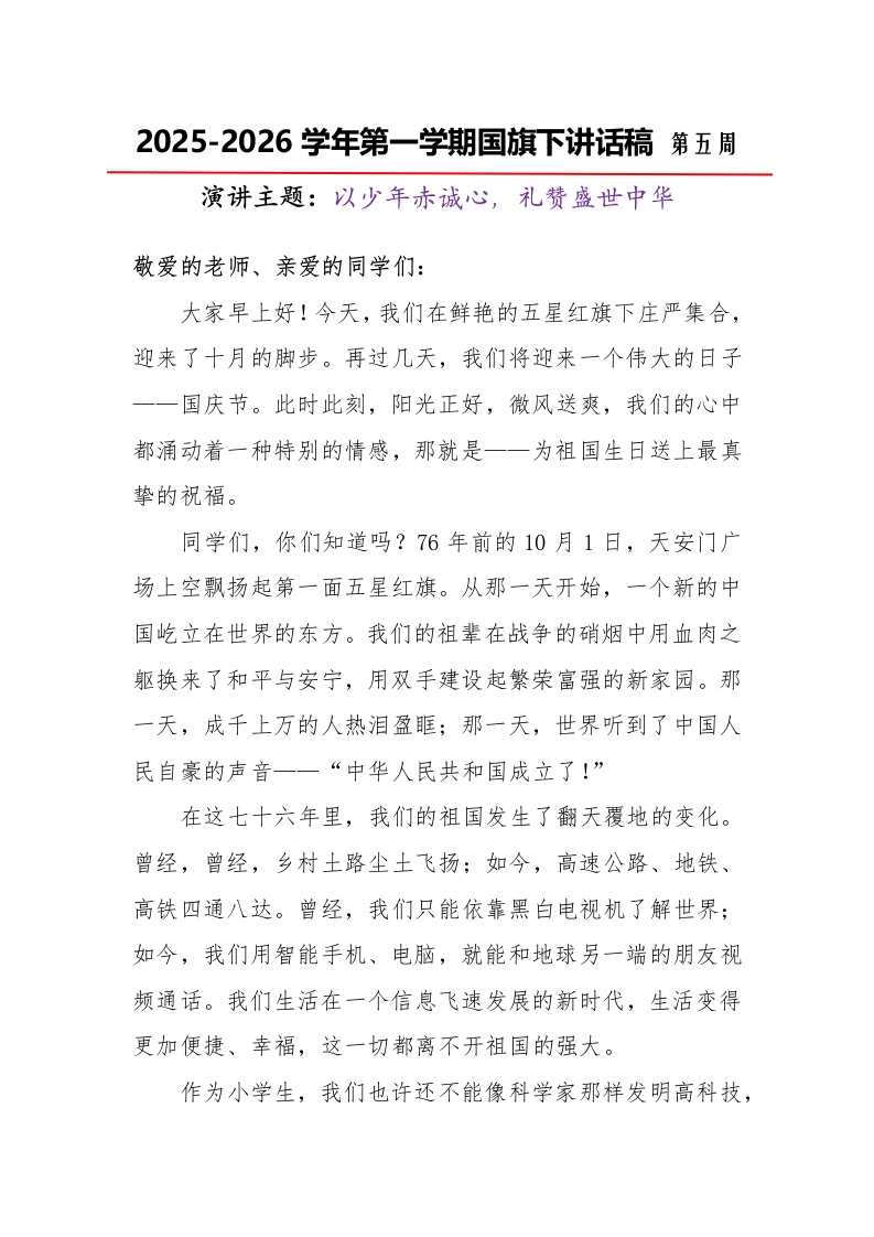 2025-2026学年第一学期国旗下讲话稿第五周演讲主题:以少年赤诚心,礼赞盛世中华敬爱的老师、亲爱的同学们:大家早上好!今天,我们在鲜艳的五星红旗下庄严集合,迎来了十月的脚步。再过几天,我们将迎来一个伟大的日子国庆节。此时此刻,阳光正好,微风送爽,我们的心中都涌动着一种特别的情感,那就是一一为祖国生日送上最真挚的祝福。同学们,你们知道吗?76年前的10月1日,天安门广场上空飘扬起第一面五星红旗。从那一天开始,一个新的中国屹立在世界的东方。我们的祖辈在战争的硝烟中用血肉之躯换来了和平与安宁,用双手建设起繁荣富强的新家园。那一天,成千上万的人热泪盈眶;那一天,世界听到了中国人民自豪的声音一一“中华人民共和国成立了!”在这七十六年里,我们的祖国发生了翻天覆地的变化。曾经,曾经,乡村土路尘土飞扬;如今,高速公路、地铁、高铁四通八达。曾经,我们只能依靠黑白电视机了解世界;如今,我们用智能手机、电脑,就能和地球另一端的朋友视频通话。我们生活在一个信息飞速发展的新时代,生活变得更加便捷、幸福,这一切都离不开祖国的强大。作为小学生,我们也许还不能像科学家那样发明高科技,