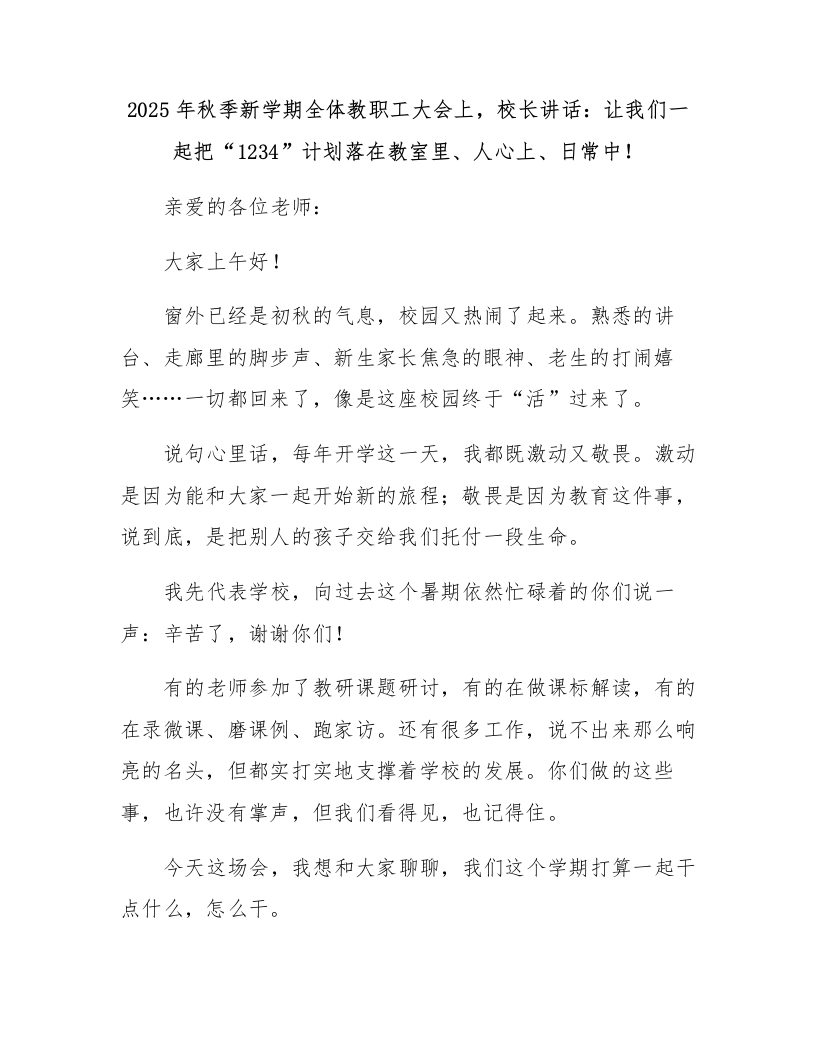 2025年秋季新学期全体教职工大会上,校长讲话:让我们一起把“1234”计划落在教室里、人心上、日常中!亲爱的各位老师:大家上午好!窗外已经是初秋的气息,校园又热闹了起来。熟悉的讲台、走廊里的脚步声、新生家长焦急的眼神、老生的打闹嬉笑…一切都回来了,像是这座校园终于“活”过来了。说句心里话,每年开学这一天,我都既激动又敬畏。激动是因为能和大家一起开始新的旅程:敬畏是因为教育这件事,说到底,是把别人的孩子交给我们托付一段生命。我先代表学校,向过去这个暑期依然忙碌着的你们说一声:辛苦了,谢谢你们!有的老师参加了教研课题研讨,有的在做课标解读,有的在录微课、磨课例、跑家访。还有很多工作,说不出来那么响亮的名头,但都实打实地支撑着学校的发展。你们做的这些事,也许没有掌声,但我们看得见,也记得住。今天这场会,我想和大家聊聊,我们这个学期打算一起干点什么,怎么干。