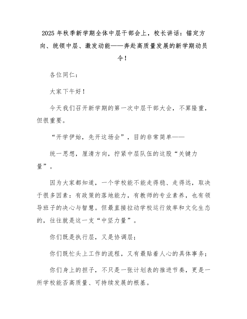 2025年秋季新学期全体中层干部会上,校长讲话:锚定方向、统领中层、激发动能一一奔赴高质量发展的新学期动员各位同仁:大家下午好!今天我们召开新学期的第一次中层干部大会,不算隆重,但很重要。“开学伊始,先开这场会”,目的非常简单一一统一思想,厘清方向,拧紧中层队伍的这股“关键力量”。因为大家都知道,一个学校能不能走得稳、走得远,取决于很多因素:有政策的落地能力,有教师的专业素养,也有领导班子的决心与智慧。但最直接拉动学校运行效率和文化生态的,往往就是这一支“中坚力量”。你们既是执行层,又是协调层:你们既忙头上工作的流程,又有最贴着人心的具体事务:你们身上的担子,不只是一张计划表的推进节奏,更是一所学校能否高质量、可持续发展的根基。