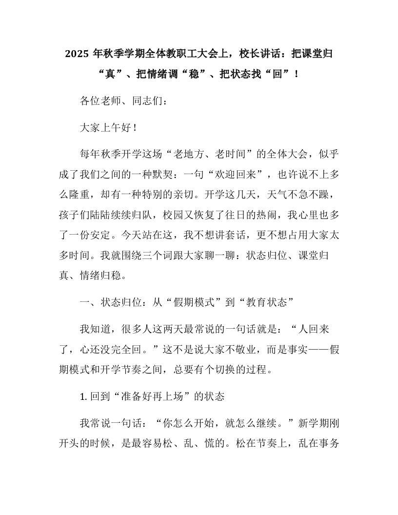 2025年秋季学期全体教职工大会上,校长讲话:把课堂归“真”、把情绪调“稳”、把状态找“回”!各位老师、同志们:大家上午好!每年秋季开学这场“老地方、老时间”的全体大会,似乎成了我们之间的一种默契:一句“欢迎回来”,也许说不上多么隆重,却有一种特别的亲切。开学这几天,天气不急不躁,孩子们陆陆续续归队,校园又恢复了往日的热闹,我心里也多了一份安定。今天站在这,我不想讲套话,更不想占用大家太多时间。我就围绕三个词跟大家聊一聊:状态归位、课堂归真、情绪归稳。一、状态归位:从“假期模式”到“教育状态”我知道,很多人这两天最常说的一句话就是:“人回来了,心还没完全回。”这不是说大家不敬业,而是事实一一假期模式和开学节奏之间,总要有个切换的过程。1.回到“准备好再上场”的状态我常说一句话:“你怎么开始,就怎么继续。”新学期刚开头的时候,是最容易松、乱、慌的。松在节奏上,乱在事务