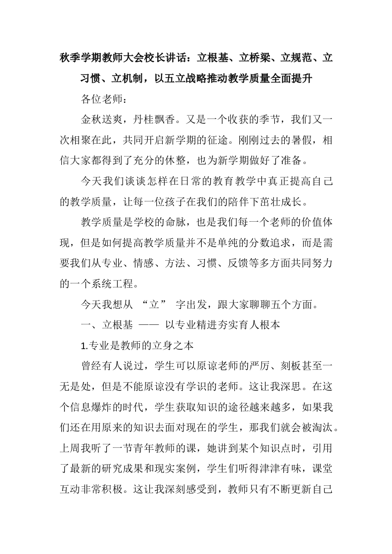 秋季学期教师大会校长讲话:立根基、立桥梁、立规范、立习惯、立机制,以五立战略推动教学质量全面提升各位老师:金秋送爽,丹桂飘香。又是一个收获的季节,我们又一次相聚在此,共同开启新学期的征途。刚刚过去的暑假,相信大家都得到了充分的休整,也为新学期做好了准备。今天我们谈谈怎样在日常的教育教学中真正提高自己的教学质量,让每一位孩子在我们的陪伴下茁壮成长。教学质量是学校的命脉,也是我们每一个老师的价值体现,但是如何提高教学质量并不是单纯的分数追求,而是需要我们从专业、情感、方法、习惯、反馈等多方面共同努力的一个系统工程。今天我想从“立”字出发,跟大家聊聊五个方面。一、立根基以专业精进夯实育人根本1.专业是教师的立身之本曾经有人说过,学生可以原谅老师的严厉、刻板甚至一无是处,但是不能原谅没有学识的老师。这让我深思。在这个信息爆炸的时代,学生获取知识的途径越来越多,如果我们还在用原来的知识去面对现在的学生,那我们就会被淘汰。上周我听了一节青年教师的课,她讲到某个知识点时,引用了最新的研究成果和现实案例,学生们听得津津有味,课堂互动非常积极。这让我深刻感受到,教师只有不断更新自己