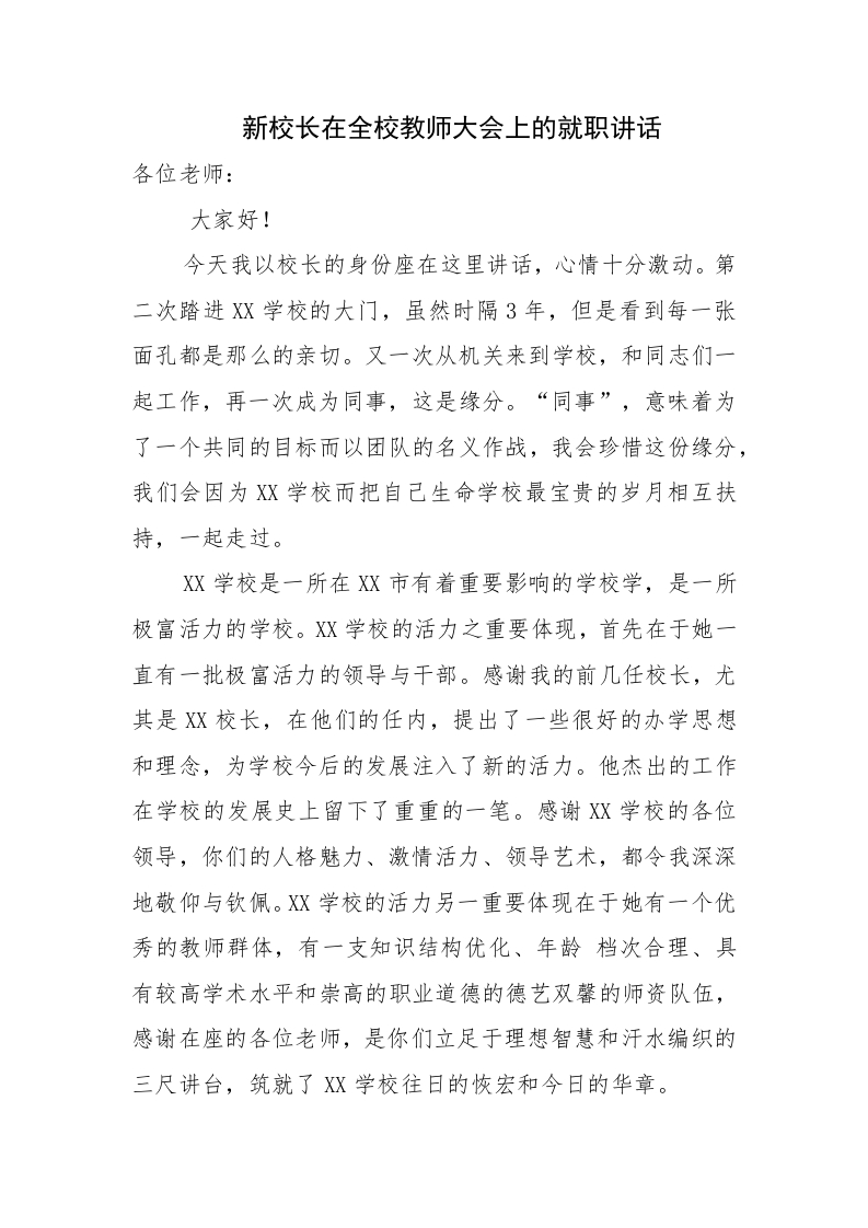 新校长在全校教师大会上的就职讲话各位老师:大家好!今天我以校长的身份座在这里讲话,心情十分激动。第二次踏进XX学校的大门,虽然时隔3年,但是看到每一张面孔都是那么的亲切。又一次从机关来到学校,和同志们一起工作,再一次成为同事,这是缘分。“同事”,意味着为了一个共同的目标而以团队的名义作战,我会珍惜这份缘分,我们会因为XX学校而把自己生命学校最宝贵的岁月相互扶持,一起走过。XX学校是一所在XX市有着重要影响的学校学,是一所极富活力的学校。X学校的活力之重要体现,首先在于她一直有一批极富活力的领导与干部。感谢我的前几任校长,尤其是XX校长,在他们的任内,提出了一些很好的办学思想和理念,为学校今后的发展注入了新的活力。他杰出的工作在学校的发展史上留下了重重的一笔。感谢XX学校的各位领导,你们的人格魅力、激情活力、领导艺术,都令我深深地敬仰与钦佩。XX学校的活力另一重要体现在于她有一个优秀的教师群体,有一支知识结构优化、年龄档次合理、具有较高学术水平和崇高的职业道德的德艺双馨的师资队伍,感谢在座的各位老师,是你们立足于理想智慧和汗水编织的三尺讲台,筑就了XX学校往日的恢宏和今日的华章。
