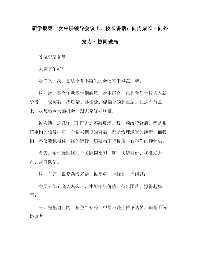 新学期第一次中层领导会议上,校长讲话:向内成长·向外发力·协同破局各位中层领导:大家下午好!我们又一次,在这个并不陌生的会议室里坐在一起。这一次,是今年秋季学期的第一次中层会,也是我们学校进入新阶段一一谋突破、提质量、补短板、促融合的起点站。在这个节点上,我想借今天的机会,跟大家好好聊聊。说实话,这几年工作压力是不减反增。每一项政策背后,都是系统重构的信号;每一个数据调取的背后,都是治理逻辑的翻新。而我们,不仅要稳得住一线的运行,还要啃下“提质与转型”的硬骨头。今天,咱们就围绕三个关键词来聊一聊:认清身份、找准发力点、带好队伍。这三个词,说复杂很复杂,说简单,也就是一个问题:中层干部到底该怎么干,才能干出价值,带出团队,撑得起局面?一、先把自己的“角色”站稳:中层不是上传下达员,而是系统协调者