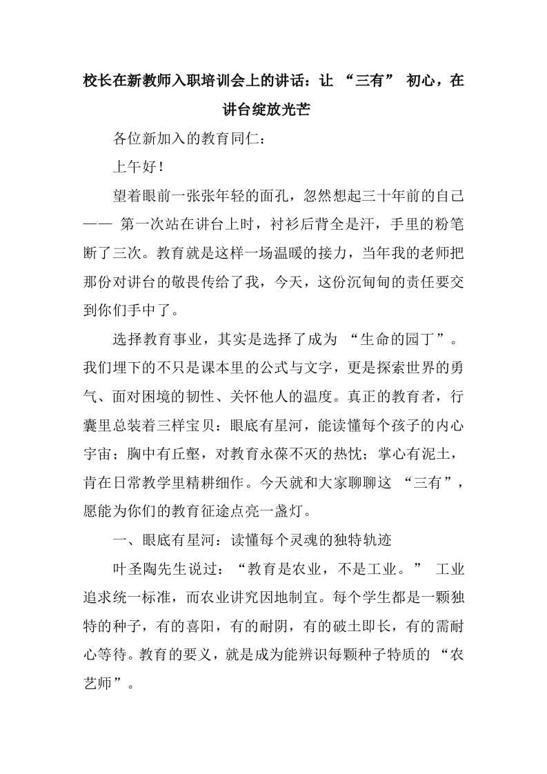 校长在新教师入职培训会上的讲话:让“三有”初心,在讲台绽放光芒各位新加入的教育同仁:上午好!望着眼前一张张年轻的面孔,忽然想起三十年前的自己第一次站在讲台上时,衬衫后背全是汗,手里的粉笔断了三次。教育就是这样一场温暖的接力,当年我的老师把那份对讲台的敬畏传给了我,今天,这份沉甸甸的责任要交到你们手中了。选择教育事业,其实是选择了成为“生命的园丁”。我们埋下的不只是课本里的公式与文字,更是探索世界的勇气、面对困境的韧性、关怀他人的温度。真正的教育者,行囊里总装着三样宝贝:眼底有星河,能读懂每个孩子的内心宇宙;胸中有丘壑,对教育永葆不灭的热忱;掌心有泥土,肯在日常教学里精耕细作。今天就和大家聊聊这“三有”,愿能为你们的教育征途点亮一盏灯。一、眼底有星河:读懂每个灵魂的独特轨迹叶圣陶先生说过:“教育是农业,不是工业。”工业追求统一标准,而农业讲究因地制宜。每个学生都是一颗独特的种子,有的喜阳,有的耐阴,有的破土即长,有的需耐心等待。教育的要义,就是成为能辨识每颗种子特质的“农艺师”。