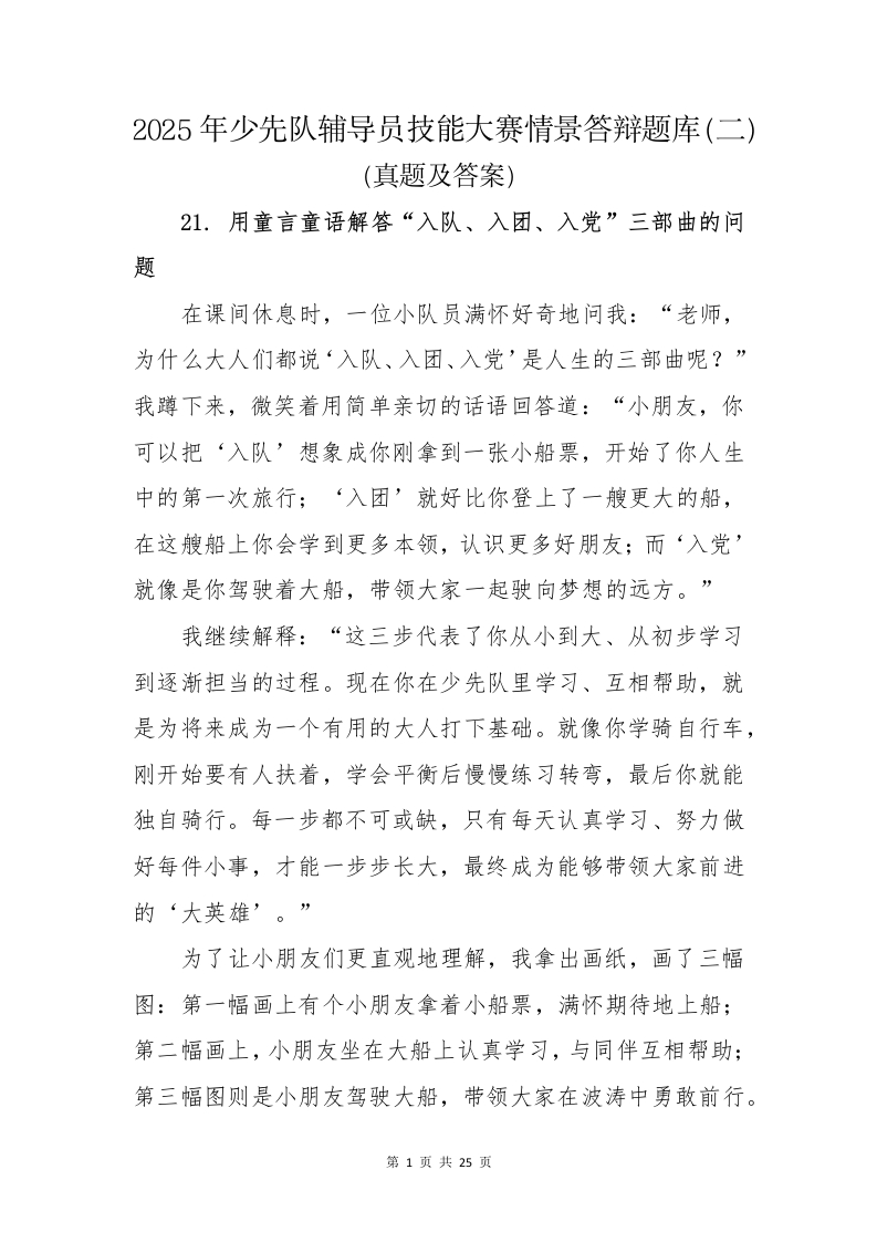 2025年少先队辅导员技能大赛情景答辩题库(二)(真题及答案)21.用童言童语解答“入队、入团、入党”三部曲的问题在课间休息时,一位小队员满怀好奇地问我:“老师,为什么大人们都说‘入队、入团、入党’是人生的三部曲呢?”我蹲下来,微笑着用简单亲切的话语回答道:“小朋友,你可以把‘入队’想象成你刚拿到一张小船票,开始了你人生中的第一次旅行;‘入团’就好比你登上了一艘更大的船,在这艘船上你会学到更多本领,认识更多好朋友;而‘入党’就像是你驾驶着大船,带领大家一起驶向梦想的远方。”我继续解释:“这三步代表了你从小到大、从初步学习到逐渐担当的过程。现在你在少先队里学习、互相帮助,就是为将来成为一个有用的大人打下基础。就像你学骑自行车,刚开始要有人扶着,学会平衡后慢慢练习转弯,最后你就能独自骑行。每一步都不可或缺,只有每天认真学习、努力做好每件小事,才能一步步长大,最终成为能够带领大家前进的‘大英雄’。”为了让小朋友们更直观地理解,我拿出画纸,画了三幅图:第一幅画上有个小朋友拿着小船票,满怀期待地上船:第二幅画上,小朋友坐在大船上认真学习,与同伴互相帮助:第三幅图则是小朋友驾驶大船,带领大家在波涛中勇敢前行。第1页共25页